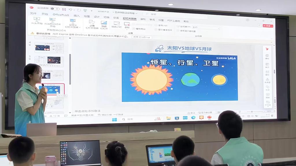 志愿者借助PPT和动画短片,从 “日心说”与 “地心说”的认知变迁讲起,细致解析八大行星的运行规律,清晰区分恒星、行星、卫星的特性。孩子们在抢答互动中梳理知识,再亲手编写代码,让虚拟的太阳、地球、月亮按规律运转。“原来宇宙是这样工作的!” 一个孩子看着自己设计的 “星空模型”,眼中满是惊叹。
