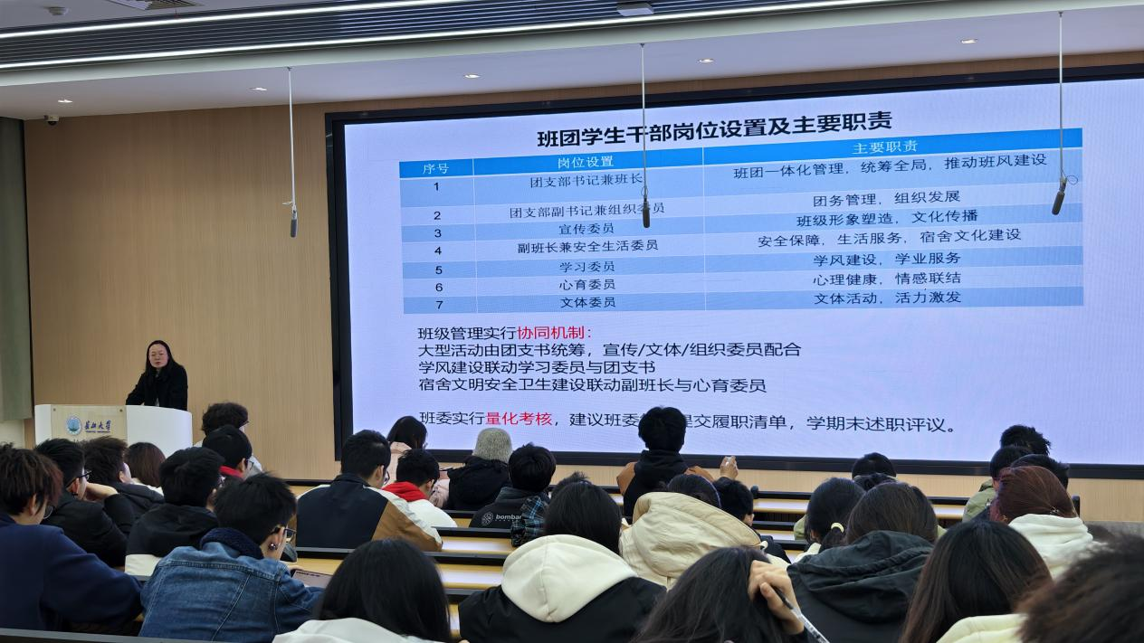 会议同步部署了班团干部岗位职责。根据《永利集团304官网班团管理细则》,班级实行“7岗协同”机制:团支书统筹全局,学习委员联动学风建设,心育委员关注心理健康,文体委员策划素质拓展活动。向云彬老师强调,班委需每月提交履职清单并接受量化考核,确保“责任到岗、服务到人”。针对寝室管理,公司推行“单元化责任制”,要求寝室长落实安全监督、卫生维护及心理关怀三项职能,如组织月度团建活动、执行晚点名“零报告”制度等,实现“小单元”带动“大集体”。